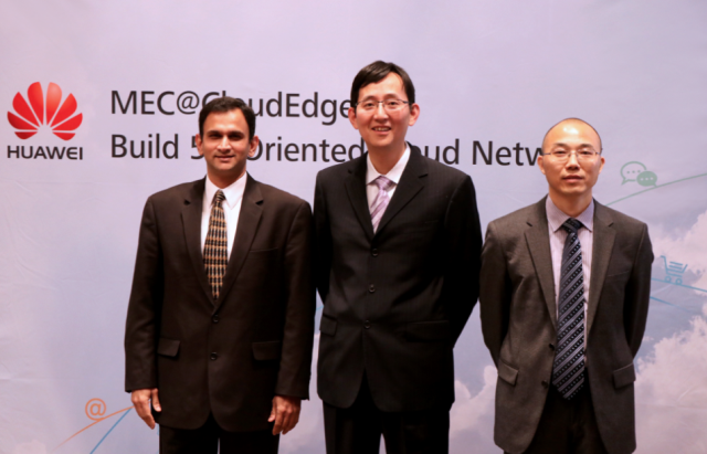 华为MEC@CloudEdge发布会现场 (从左至右:IDC分析师研究主管Sathya Atreyam, 华为Cloud Packet Core 产品线总裁戴继盛,华为云核心网营销运作部部长张勤)