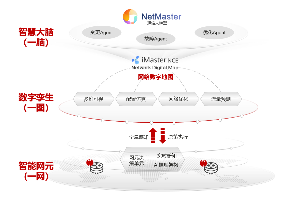 华为为网络变更场景构筑了安全防线,确保错误0入网。1). 采用数字孪生技术,把物理网络转换成数字化网络,1:1仿真出协议状态、路由变化、业务路径、流量等变化。2). 利用AI大模型技术,精准识别变更影响的风险。