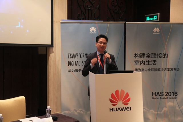 华为室内全联接解决方案总经理梁世铭在发布会上发表演讲