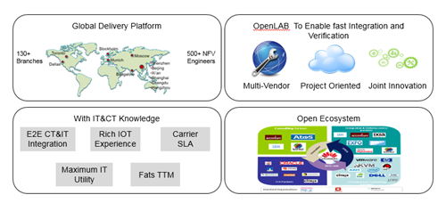 华为和全球众多领先大T有着多年的合作经验,在创新领域和第三方合作伙伴不断的积极探索,生态环境也越来越丰富。500+优秀的NFV专家遍布全球,五大OpenLAB相继成立,与多厂家展开全面合作。在运营商转型大潮中,华为将成为客户未来转型中最忠实的伙伴和最坚强的后盾。