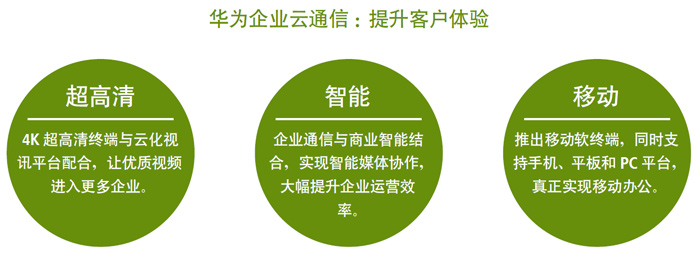 超高清:匹配客户从标清到高清再到超高清的趋势,华为系列化超高清终端,与云化视讯平台配合可端到端给用户提供超高清视频体验;低带宽处理技术可在同等视频分辨率下,节省50%的带宽占用,即便在复杂多变的互联网环境,例如丢包30%的情况下,仍能保持良好的视频质量。通过自有芯片和算法,华为不断降低视频终端的 体积、重量和成本,推出了多款轻量化视频终端,让优质视频进入到更多的企业。