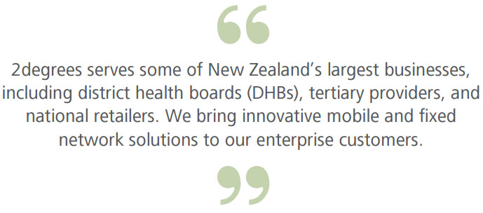 2degrees serves some of New Zealand’s largest businesses, including district health boards (DHBs), tertiary providers, and national retailers. We bring innovative mobile and fixed network solutions to our enterprise customers. Recently, 2degrees was appointed to the Government’s Telecommunications as a Service (TaaS) provider panel, meaning we can now provide updated mobile services and new fixed connectivity services for the government.