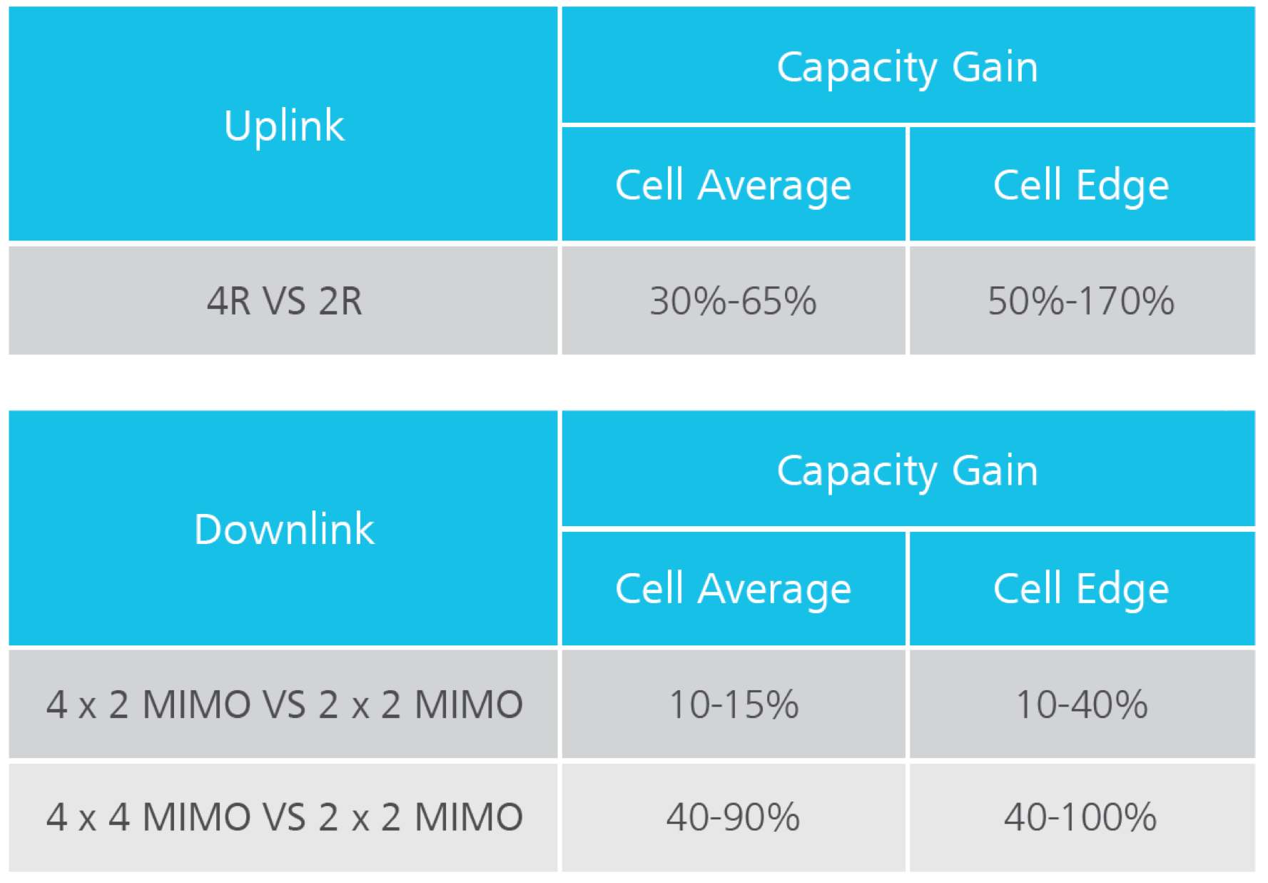 Since the capacity becomes a major challenge in the mobile broadband (MBB) era, MIMO enables multiple antennas to transmit and receive signals on both the uplink and downlink. Generally, at least 2 x 2 MIMO antennas are required for LTE and 4 x 4 MIMO antennas are required for LTE-Advanced. Table 1 lists the network capacities on both the uplink and downlink supported by MIMO.